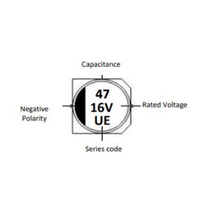 SMD Aluminum Electrolytic Capacitors, Low ESR/Impedance type UE series, 2 pads Capacitance: 47µF, Tolerance ±20%, Voltage 16V, Case size: ØD6.3*L5.40mm, Impedance 1.1Ω, 2000 Hours, RC: 115 mA (at 105 ℃,100KHz), Operating Temp. Range -55°C ~+105°C